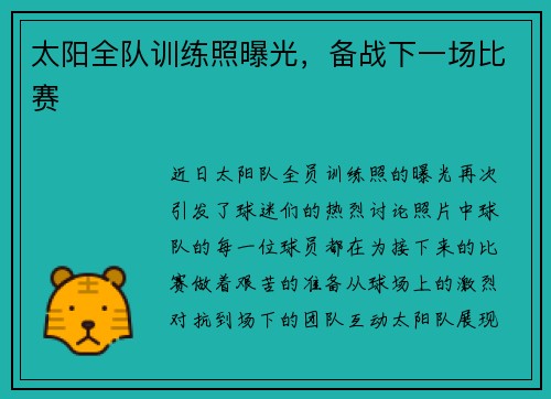 近日,太阳队全员训练照的曝光再次引发了球迷们的热烈讨论。照片中,球队的每一位球员都在为接下来的比赛做着艰苦的准备。从球场上的激烈对抗到场下的团队互动,太阳队展现出了一股强大的凝聚力和奋发向上的决心。 这组训练照是太阳队近期备战的重要一环,通过这些照片,我们可以清晰地看到每一位球员的训练状态以及他们对胜利的渴望。无论是明星球员还是年轻新秀,大家都在以最饱满的精神状态投入到训练中,展现出超强的体能与技...